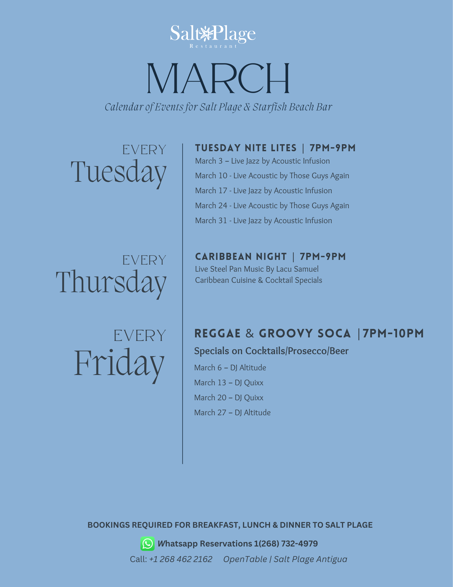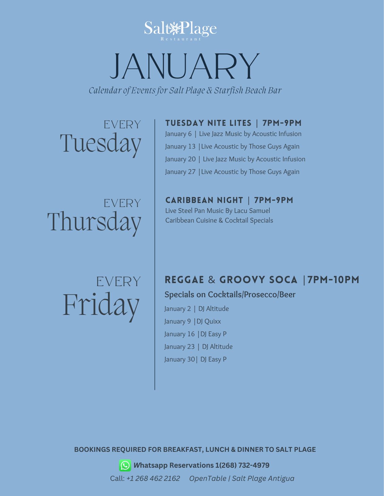 Tuesday Night Lites Groove to live acoustic or jazz music and sip on cocktail specials. Every Tuesday 7-9pm at Salt Plage restaurant. Caribbean Night Experience an assortment of Caribbean flavors with our local specials. Listen to the sweet sound of live steelpan music. Every Thursday 7-9pm, at Salt Plage Restaurant. Reggae On The Beach Picture a warm sunset, sandy shores and the rhythmic beats of reggae music setting the mood. It's the perfect recipe for relaxation and good vibes. Every Friday 6pm-9pm, at Starfish Beach Bar.