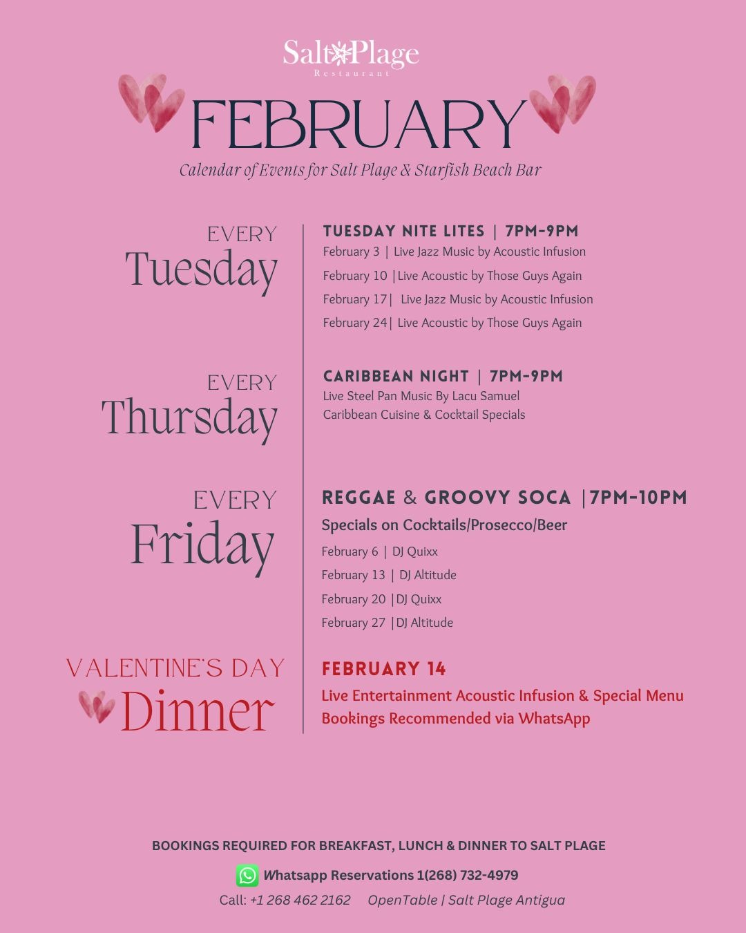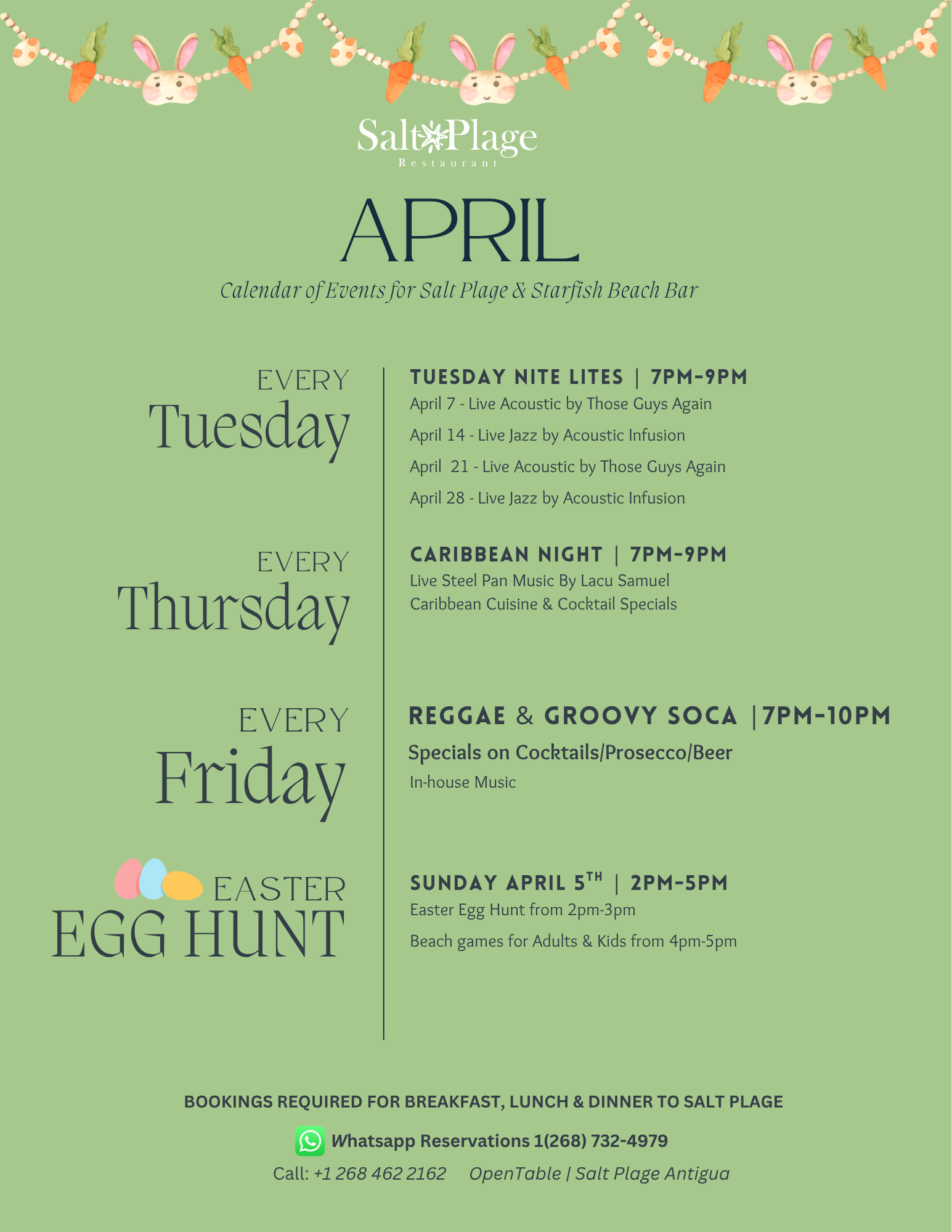 Caribbean Night Experience an assortment of Caribbean flavors with our island inspired dishes and cocktail specials! Listen to the sweet sound of live steelpan music. Every Thursday 7-9pm, at Salt Plage Restaurant.